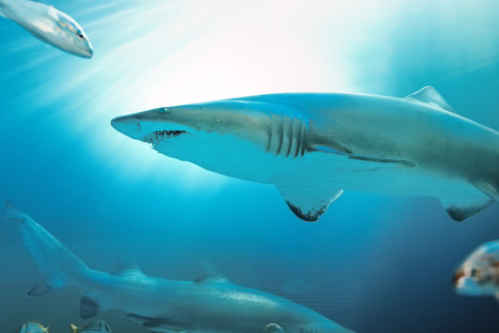 Sand tiger sharks have an intimidating appearance, with rows of long, needle-like teeth visible even when their mouth is closed. Despite their fierce look, they are slow-moving and docile toward humans. Unlike most sharks, they gulp air at the surface and store it in their stomach, allowing them to hover motionlessly without sinking.
